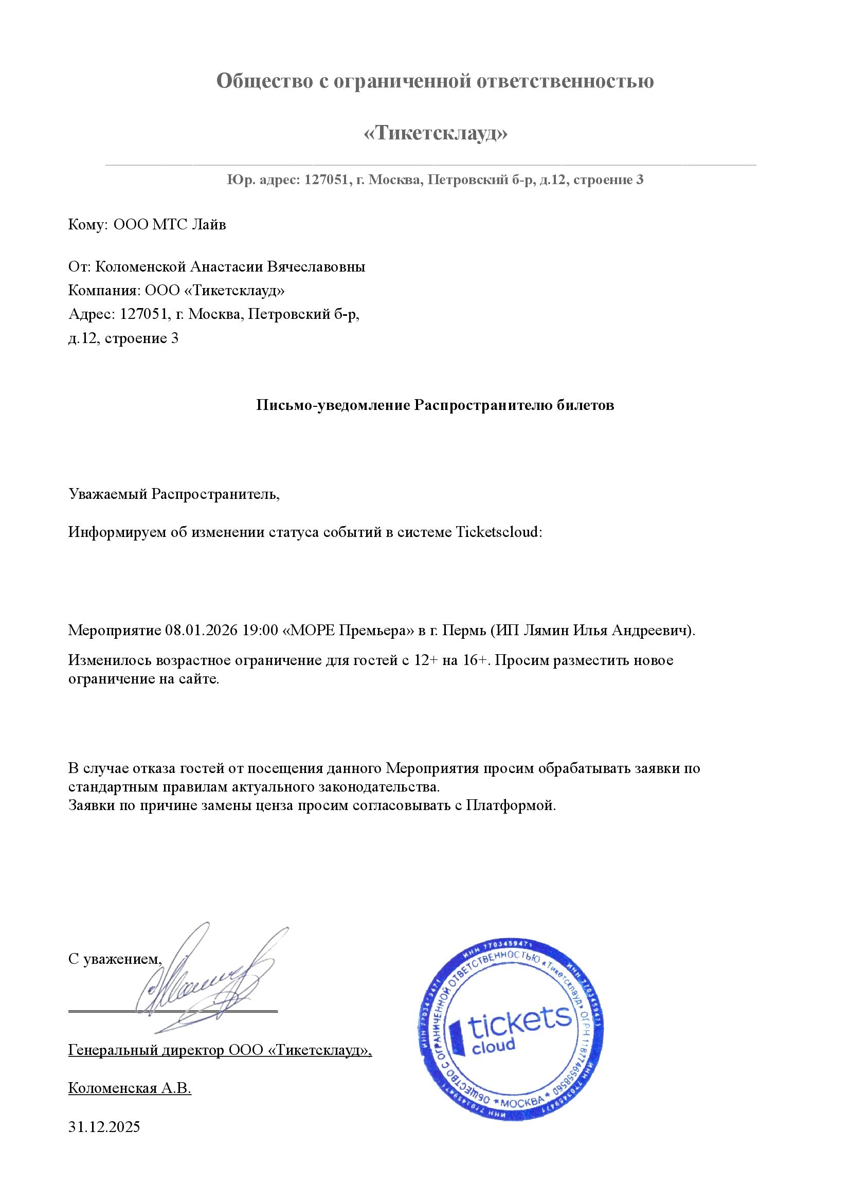 Уважаемый клиент! Спешим сообщить, что по информации, полученной от организатора, у мероприятия «Море», запланированного на 8 января 2026 года в 19:00 в Молодежном театре, изменен возрастной ценз на 16+. Условия возврата будут объявлены дополнительно. С уважением, команда поддержки Ticketland.