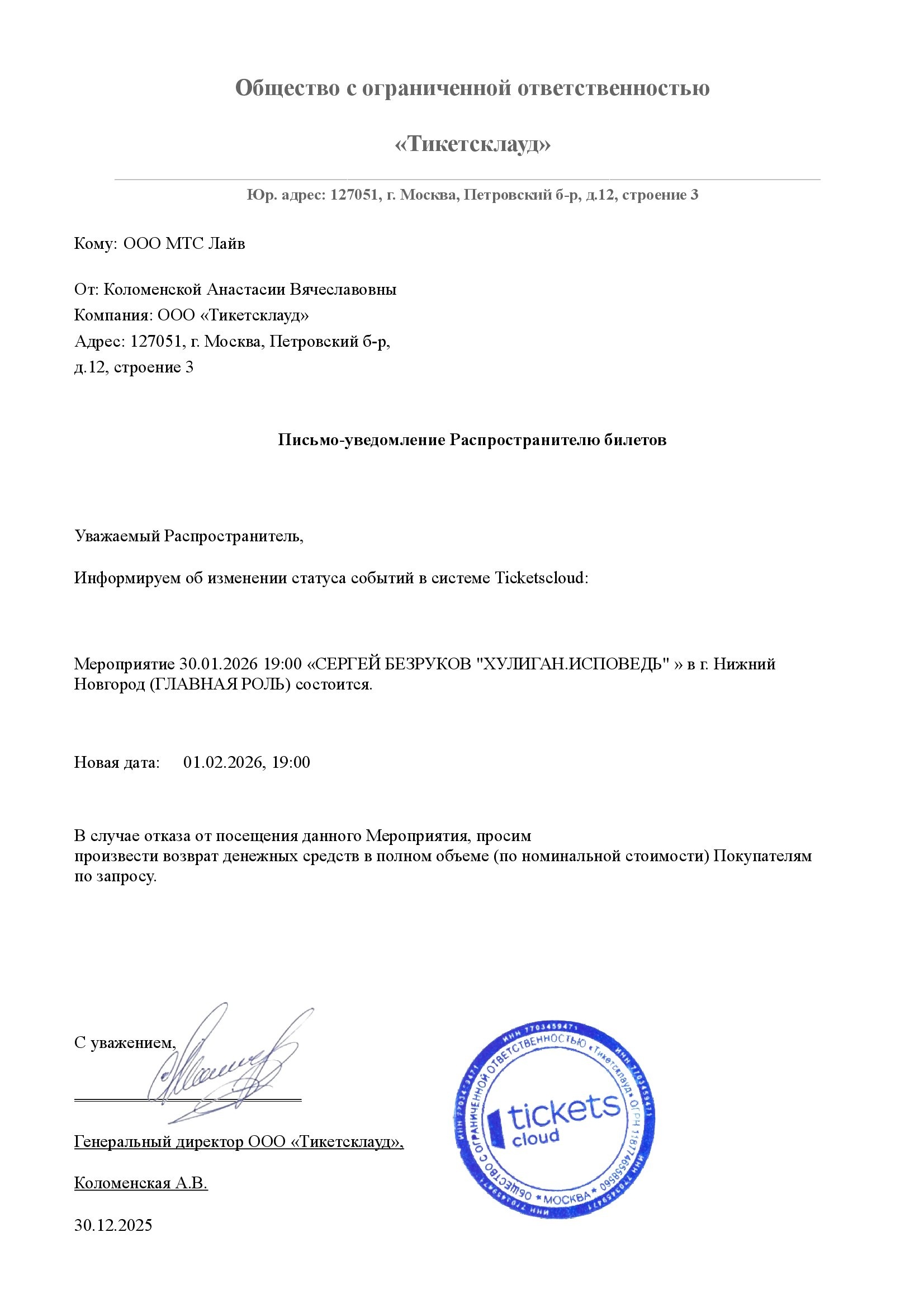 Уважаемый клиент! Спешим сообщить, что по информации, полученной от организатора, спектакль «Хулиган. Исповедь», запланированный на 31 января 2026 года в 19:00 в МТС Live Холле, перенесен на 1 февраля 2026 года, начало в 19:00. Ранее приобретенные билеты действительны на новую дату, обменивать их не нужно. Если вам не удобно посетить мероприятие в новую дату, вы можете вернуть билет по кнопке в личном кабинете во вкладке «Заказы». Деньги за электронные билеты вернутся автоматически в полном объёме на карту, с которой была произведена оплата. Если вы купили билет в кассе Ticketland.ru за наличный расчет, то обратитесь, пожалуйста, на почту: vozvrat@ticketland.ru. С уважением, команда поддержки Ticketland.