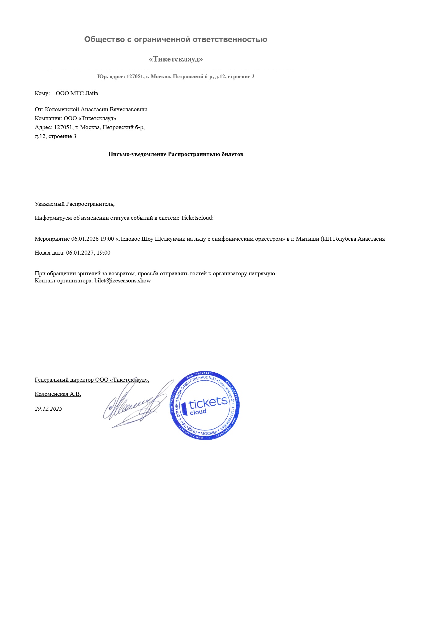 Уважаемый клиент! Спешим сообщить, что по информации, полученной от организатора, Ледовое шоу «Щелкунчик на льду с симфоническим оркестром», запланированный на 6 января 2026 года в 19:00 на площадке «Арена «Мытищи», перенесён на 6 января 2027 года, начало в 19:00. Ранее приобретенные билеты действительны, обменивать их не нужно. По вопросам возврата билетов обращайтесь, пожалуйста, к организатору спектакля по электронной почте: bilet@iceseasons.show С уважением, команда поддержки Ticketland.