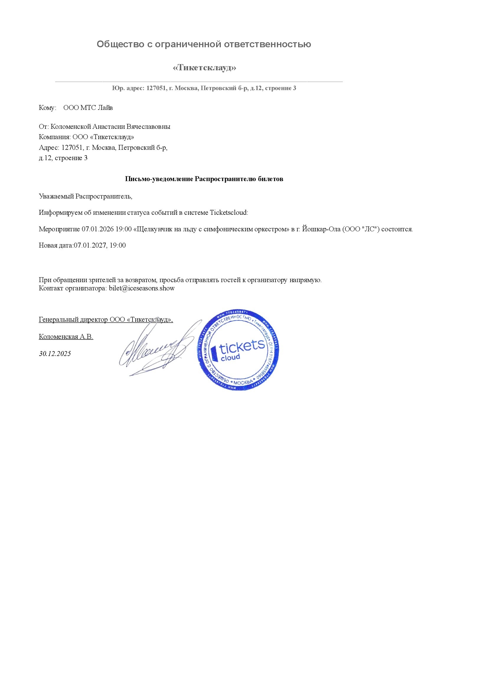 Уважаемый клиент! Спешим сообщить, что по информации, полученной от организатора, спектакль «Щелкунчик на льду с симфоническим оркестром», запланированный на 7 января 2026 года в 19:00 в ЛД «Марий Эл», перенесён на 7 января 2027 года в 19:00. Ранее приобретенные билеты действительны, обменивать их не нужно. По вопросам возврата билетов обращайтесь, пожалуйста, к организатору спектакля по электронной почте: bilet@iceseasons.show Письмо от организатораС уважением, команда поддержки Ticketland.