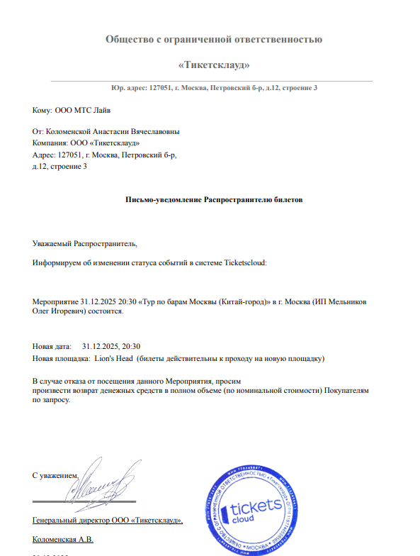 Уважаемый клиент! Спешим сообщить, что по информации, полученной от организатора, Тур по барам Москвы (Китай-город), запланированный на 31.12.2025 в 20:30 вбаре «Дело не в вине», состоится на площадке Lion's Head. Ранее приобретенные билеты действительны, обменивать их не нужно. Если вам не удобно посетить мероприятие, вы можете вернуть билет по кнопке в личном кабинете во вкладке «Заказы». Деньги за электронные билеты вернутся автоматически в полном объёме на карту, с которой была произведена оплата. Если вы купили билет в кассе Ticketland.ru за наличный расчет, то обратитесь, пожалуйста, на почту: vozvrat@ticketland.ru. С уважением, команда поддержки Ticketland.