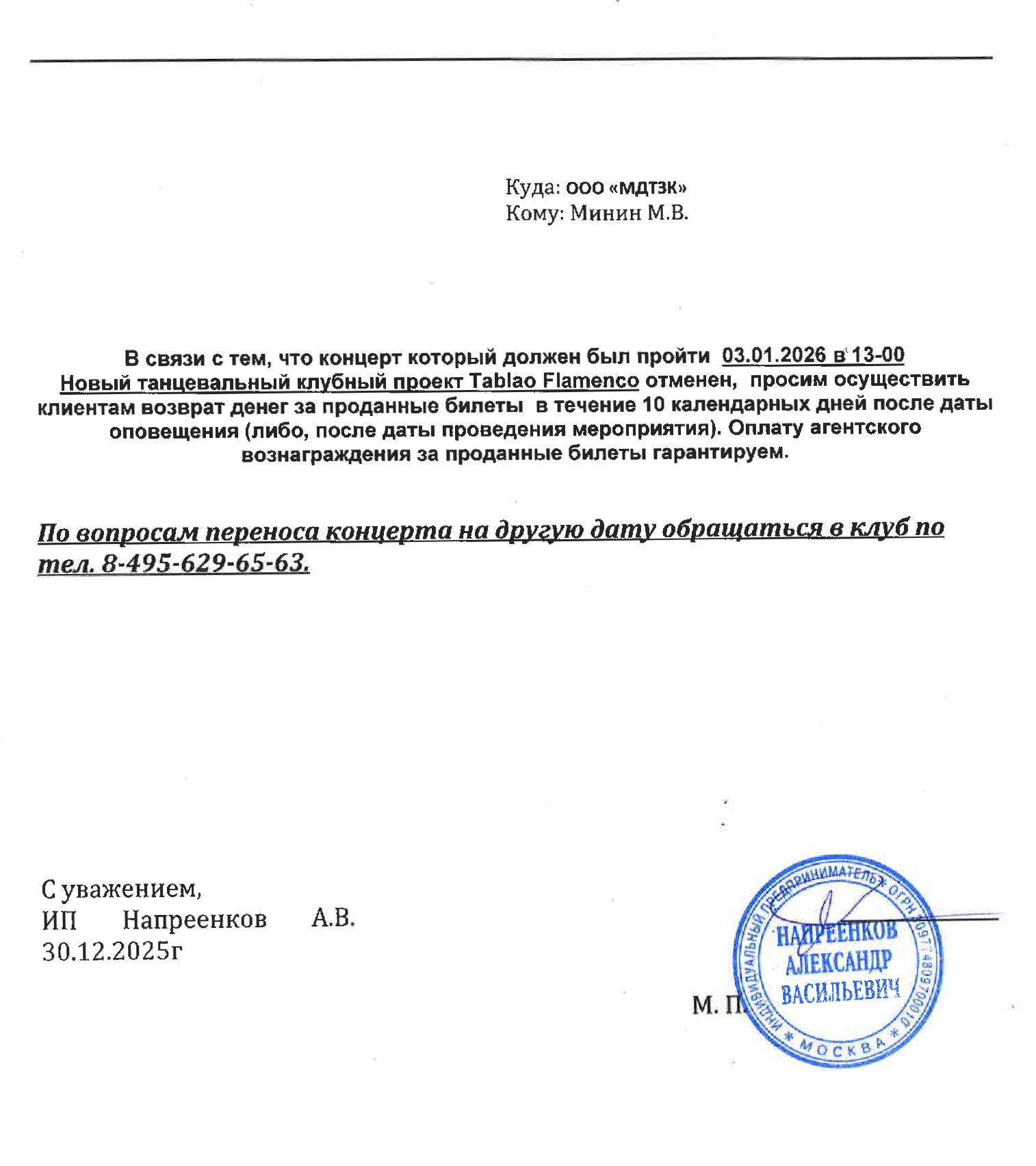 Уважаемый клиент! Спешим сообщить, что по информации, полученной от организатора, Новый танцевальный клубный проект Tablao Flamenсo, запланированный на 3 января 2026 года в 13:00 в Джаз Клубе «Союз композиторов», отменён. Деньги за электронные билеты вернутся автоматически в полном объёме на карту, с которой была произведена оплата. Если вы купили билет в кассе Ticketland.ru за наличный расчет, то обратитесь, пожалуйста, на почту: vozvrat@ticketland.ru. С уважением, команда поддержки Ticketland.