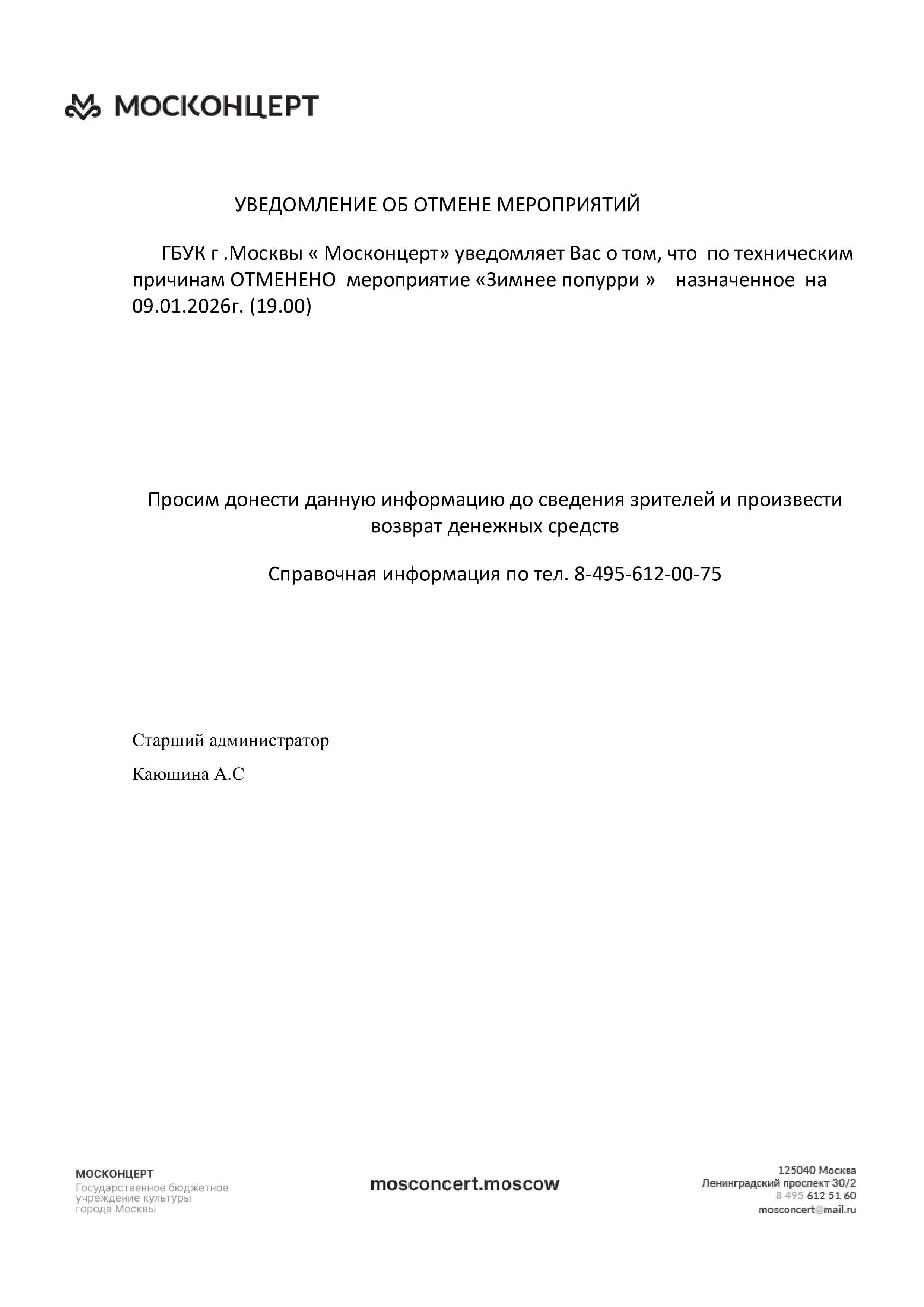 Уважаемый клиент! Спешим сообщить, что по информации, полученной от организатора, концерт «Зимнее попурри», запланированный на 9 января 2026 года в 19:00 в Доме романса, отменён. Деньги за электронные билеты вернутся автоматически в полном объёме на карту, с которой была произведена оплата. Если вы купили билет в кассе Ticketland.ru за наличный расчет, то обратитесь, пожалуйста, на почту: vozvrat@ticketland.ru. С уважением, команда поддержки Ticketland.
