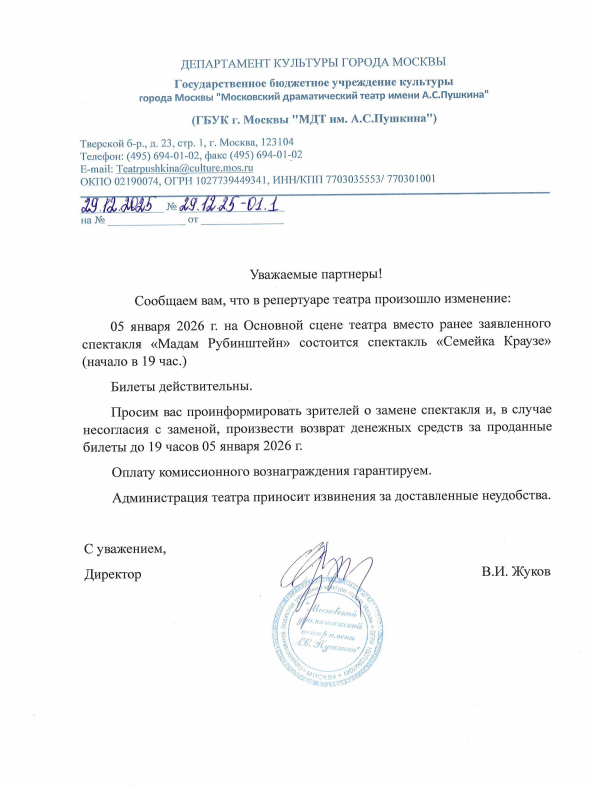 Уважаемый клиент! Спешим сообщить, что по информации, полученной от организатора, спектакль «Мадам Рубинштейн», запланированный на 2026-01-05 в 19:00 в Театре имени А.С. Пушкина, заменяется на спектакль «Семейка Краузе». Ранее приобретенные билеты действительны, обменивать их не нужно. Если вам не интересно посетить мероприятие, вы можете вернуть билет по кнопке в личном кабинете во вкладке «Заказы». Деньги за электронные билеты вернутся автоматически в полном объёме на карту, с которой была произведена оплата. Если вы купили билет в кассе Ticketland.ru за наличный расчет, то обратитесь, пожалуйста, на почту: vozvrat@ticketland.ru. С уважением, команда поддержки Ticketland.